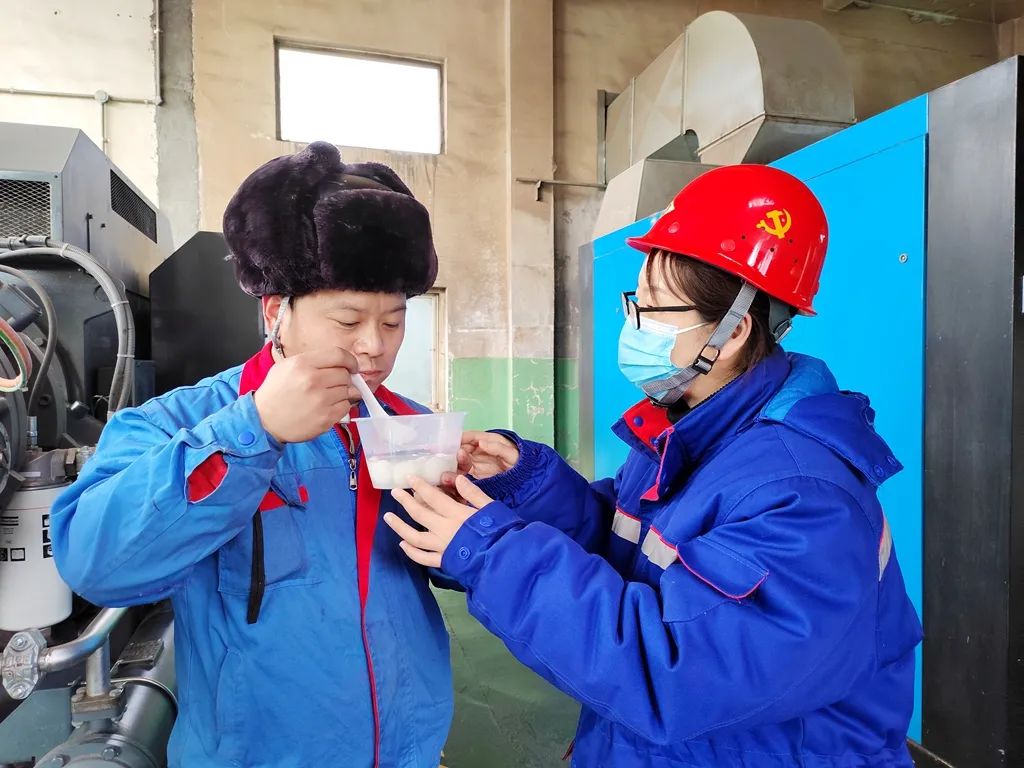 该矿在井口,女工们为上下井职工递上热腾腾的汤圆,送祝福、嘱安全,让职工师傅们一升井就能吃到热乎乎的元宵,甜甜的、热腾腾的元宵温暖着矿工的心,纷纷表示不负大家的期望,上标准岗,干标准活,为安全生产贡献自己的一份力量,矿区呈现一片喜庆祥和、浓情欢乐的节日氛围。(王正帅 张燕)