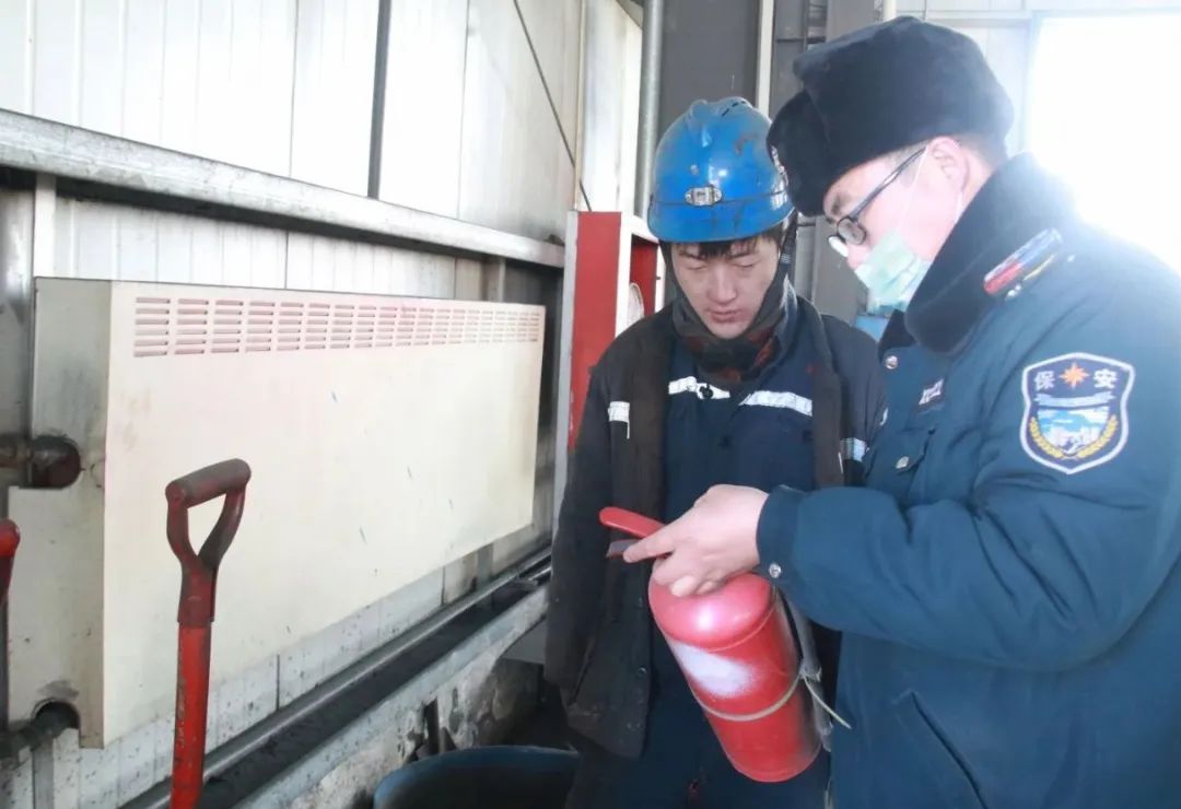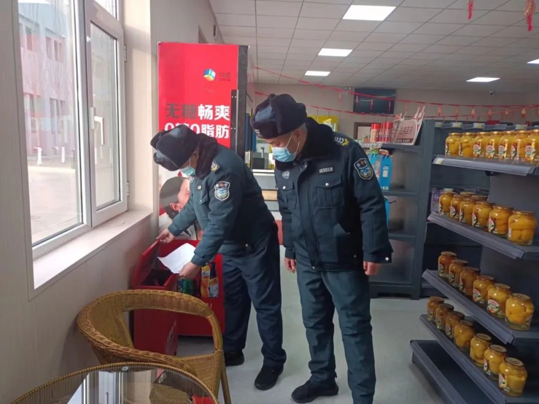 1月27日,长城五矿治安保障中心巡逻人员张道民、袁中华在矿区超市巡检消防设施,他们走遍地面每个角落,认真排查消防隐患,切实筑牢节日期间矿井消防安全“防火墙”。